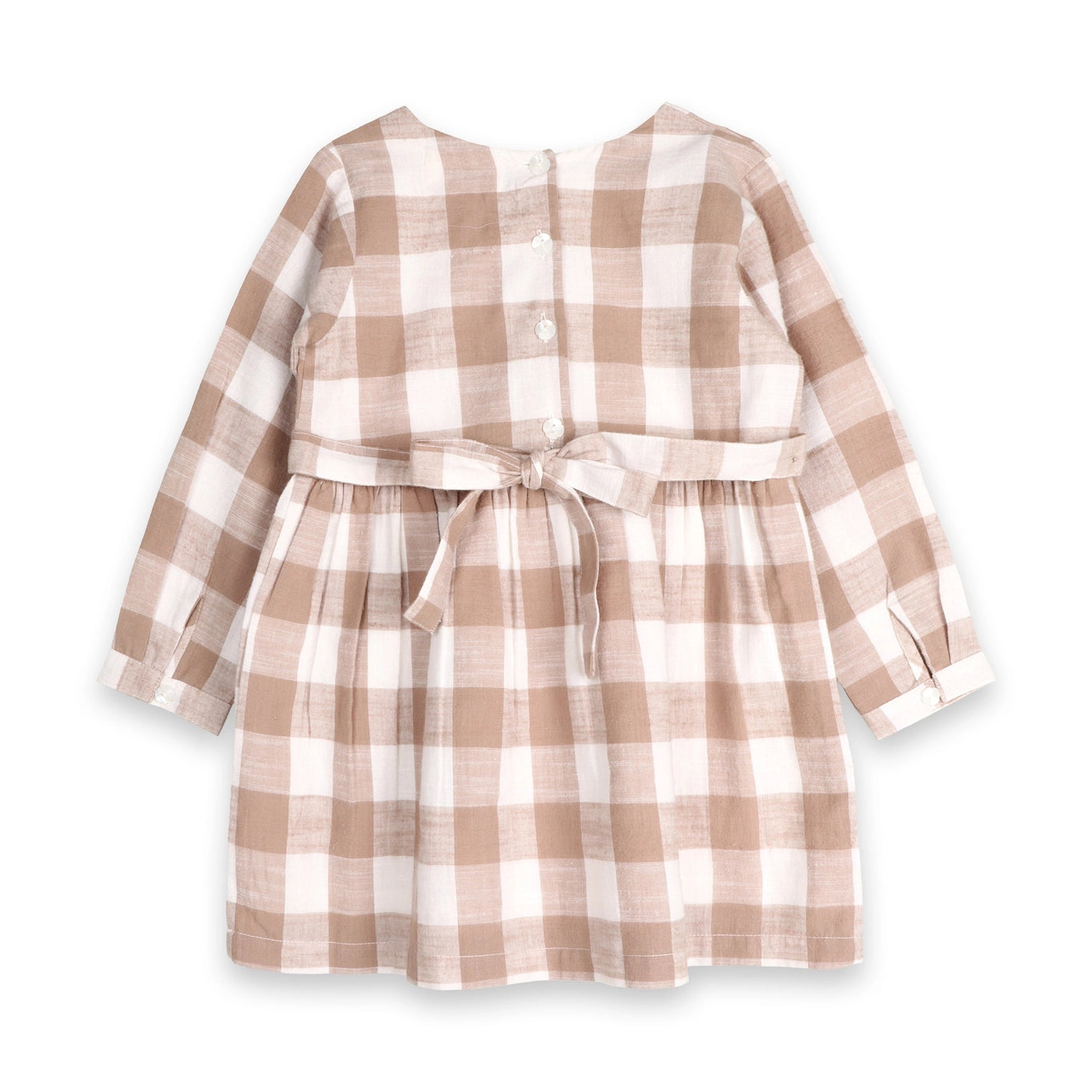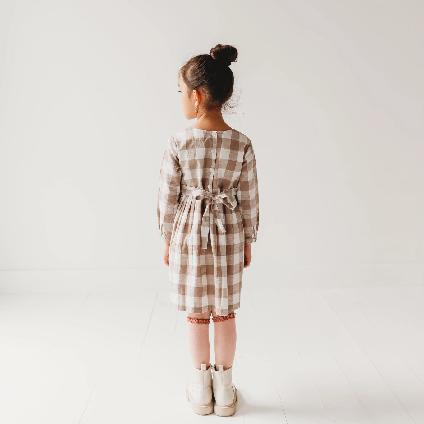 Introducing the Gingham Mouse Play Dress! Wrap your little one in winter wonder with this adorable mouse grey gingham dress! Features: - Softest brushed cotton fabric for cozy warmth and comfort - Classic gingham pattern in mouse grey hue, perfect for winter play - Ruffles and bows at the front add a touch of whimsy and charm - Cuffed collars for a sweet, vintage finish - Fully lined for extra warmth and special winter comfort Perfect for winter adventures, holiday gatherings, and making magical memories!