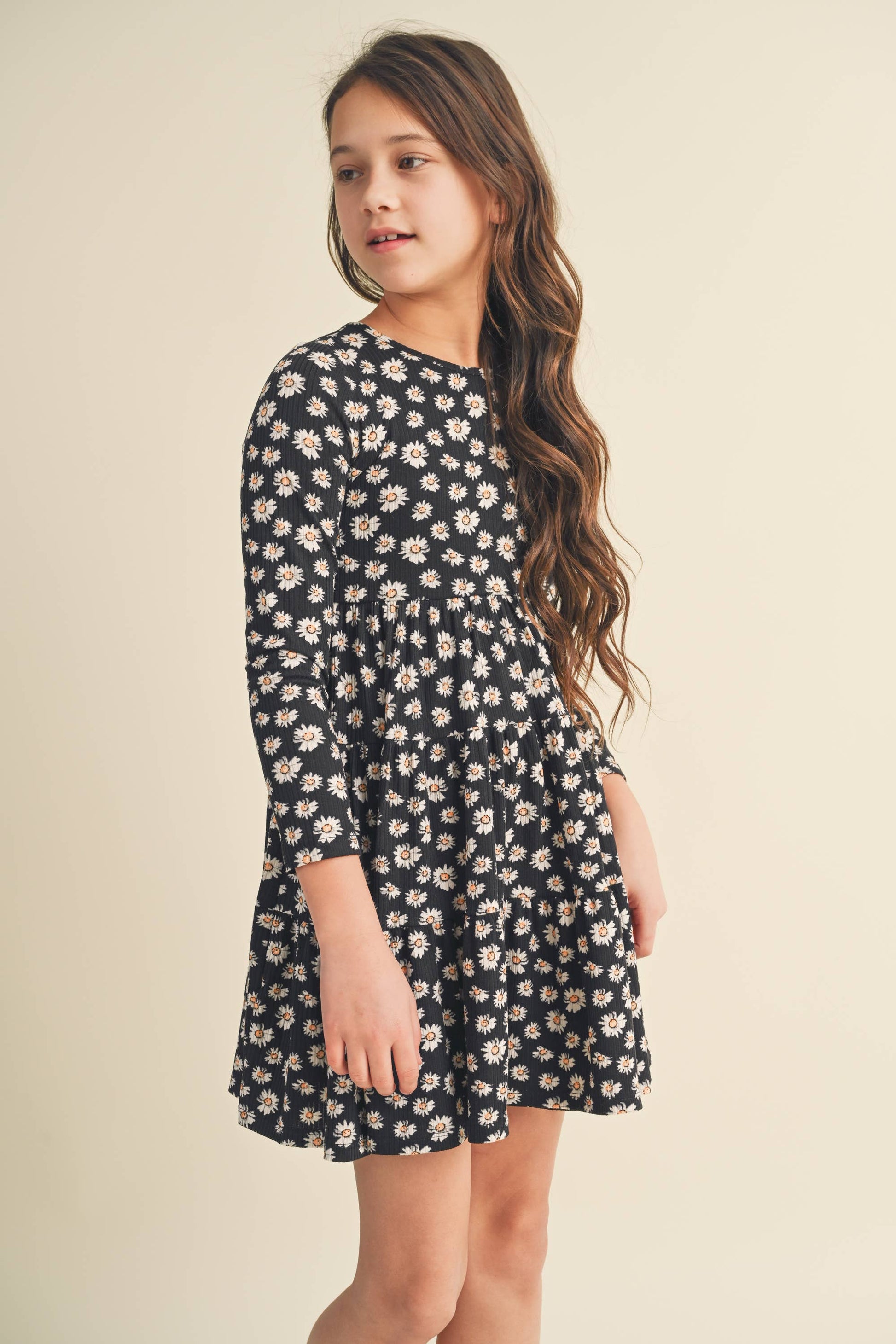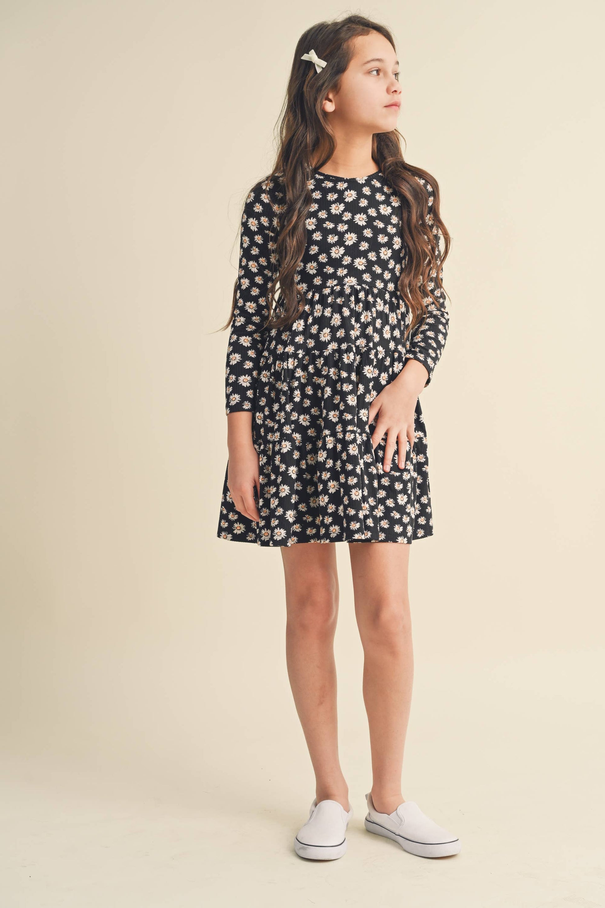 The long-sleeved tiered dress is versatile and can be worn for various occasions, ranging from casual outings to family events.